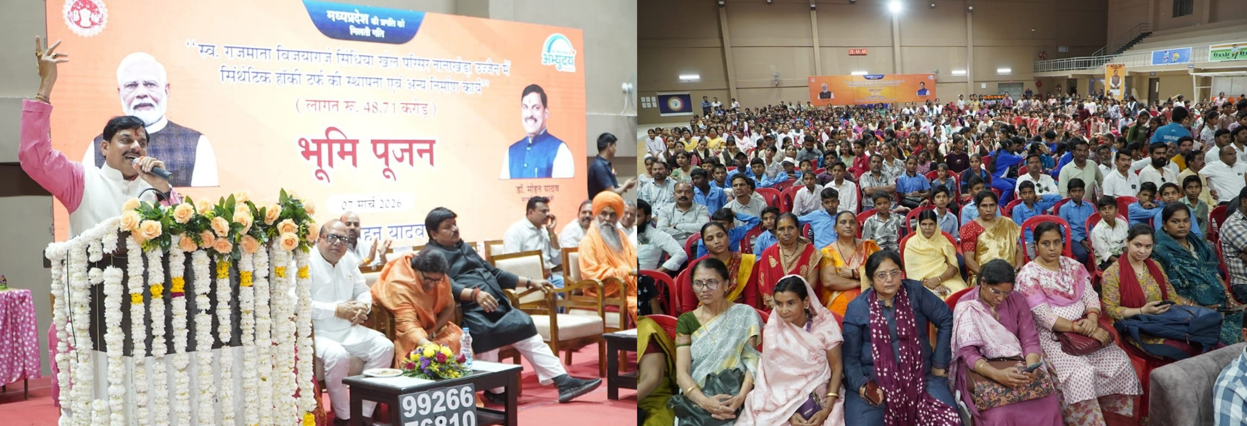 मुख्यमंत्री डॉ. मोहन यादव ने कहा कि भगवान श्री महाकालेश्वर और श्री गोपाल कृष्ण की हम सभी पर विशेष कृपा है। उनके आशीर्वाद से आज उज्जैन और पूरे प्रदेश के खिलाडियों को सौगात मिलने जा रही है। स्पोर्टस कॉम्प्लेक्स में निरंतर उज्जैन में विकास के कार्य हो रहे है। खेल केवल मनोरंजन नहीं बल्कि शारीरिक, मानसिक एवं सामाजिक विकास का सशक्त माध्यम है। खेल अनुशासन, टीम भावना, नेतृत्व क्षमता और सकारात्मक प्रतिस्पर्धा की भावना विकसित करते हैं। मुख्यमंत्री डॉ. यादव ने शनिवार को उज्जैन में स्व. राजमाता विजयाराजे सिंधिया खेल परिसर नानाखेडा स्टेडियम परिसर में 48.71 करोड रुपए की लागत से बनने वाले अंतर्राष्ट्रीय स्तर के सिन्थेटिक हॉकी टर्फ और पवेलियन दर्शक दीर्घा के निर्माण कार्य के भूमि- पूजन कार्यक्रम को संबोधित करते हुए ये बातें कही।