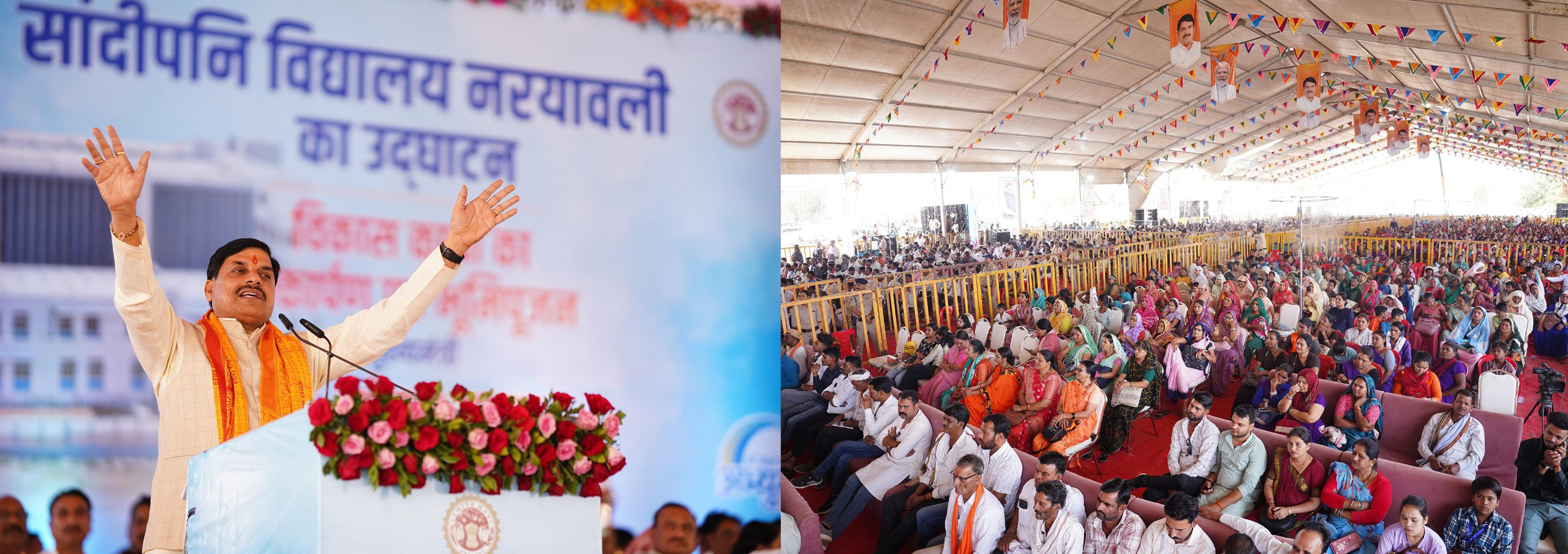 मुख्यमंत्री डॉ. यादव ने कहा कि प्रदेश में बन रहे आधुनिक सांदीपनि विद्यालय प्राइवेट स्कूलों को पीछे छोड़ रहे हैं। वर्ष 2025-26 में बोर्ड परीक्षाओं का परिणाम आया तो सरकारी स्कूलों के बच्चों ने सर्वोच्च स्थान हासिल किया है। बेटियों ने परीक्षाओं में बाजी मारी है। राज्य सरकार स्कूल टॉपर विद्यार्थियों को स्कूटी और मेधावी विद्यार्थियों को लैपटॉप दे रही है। नरयावली क्षेत्र डॉ. हरिसिंह गौर के समय से शिक्षा का पावन मंदिर रहा है। यहां कोई शासकीय विश्वविद्यालय नहीं था, इसीलिए नरयावली में रानी अवंतीबाई के नाम पर राजकीय विश्वविद्यालय शुरू करने की पहल की गई। नरयावली को आज 27 करोड़ रुपए लागत के सांदीपनि विद्यालय की सौगात मिली है, जो भविष्य निर्माण का प्रमुख केंद्र बनेगा। जरुआखेड़ी में 10 करोड़ की लागत से नवीन आईटीआई भवन, 60 सीटर छात्रावास और आवासीय भवनों का लोकार्पण भी हुआ है। आज इस ऐतिहासिक अवसर पर नरयावली की जनता को 58 करोड़ 46 लाख रुपए लागत के 98 विकास कार्यों के लोकार्पण और भूमि-पूजन की सौगात मिली है। बुंदेलखंड में 2023 के बाद से 500 किलोमीटर से अधिक की सड़कें बन चुकी हैं। जिला अस्पताल में 100 बेड के नए वार्ड का निर्माण किया जा रहा है। सागर जिले में 6 अलग-अलग नए औद्योगिक क्षेत्र विकसित किए जा रहे हैं। यहां एमएसएमई का एक क्लस्टर भी बनाया जा रहा है। बीना रिफाइनरी के माध्यम से कई बड़े प्रोजेक्ट यहां आ रहे हैं।